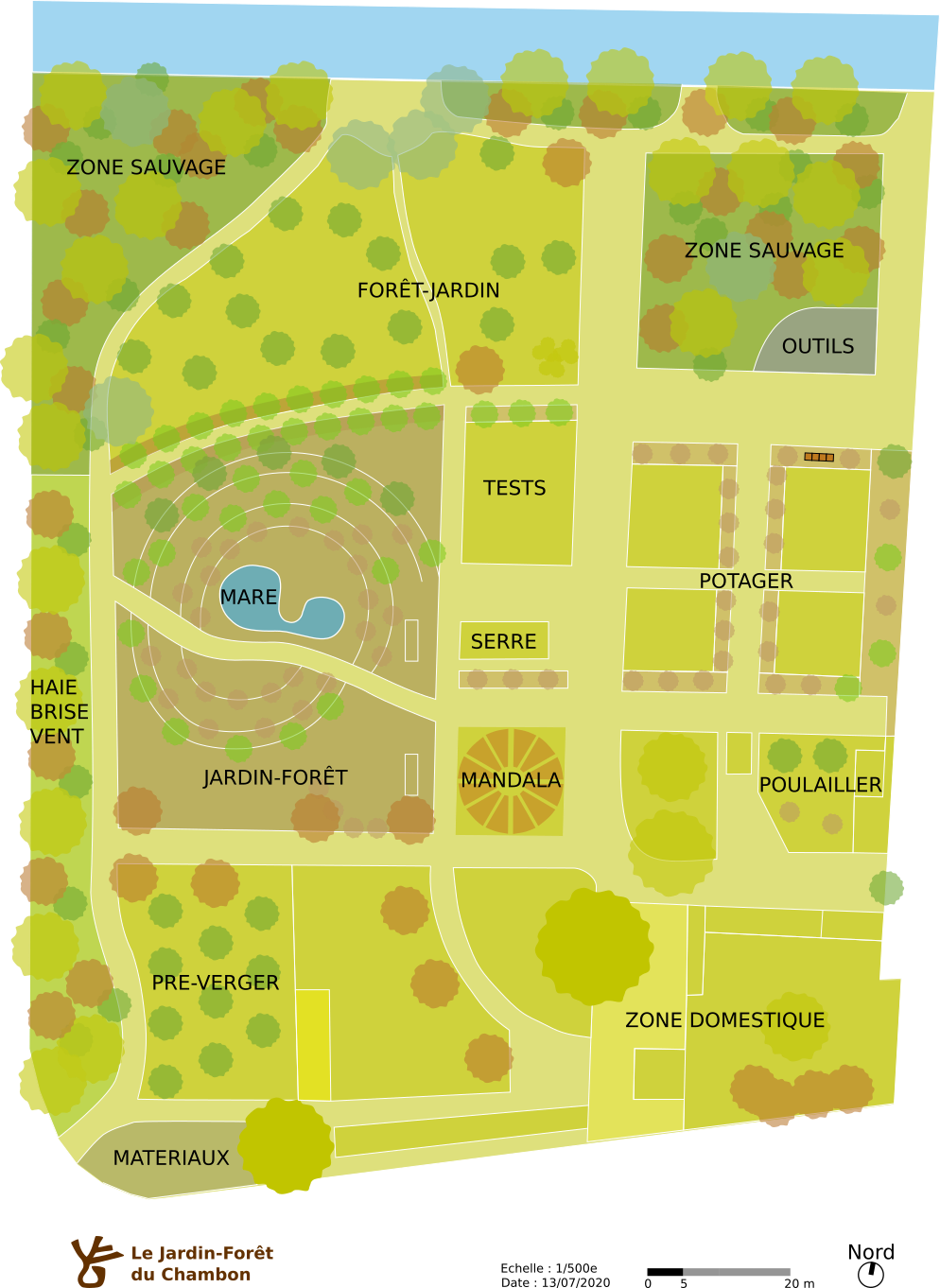 La partie nord du jardin-forêt forme un fer à cheval ouvert vers le sud. La mare se situe au centre.